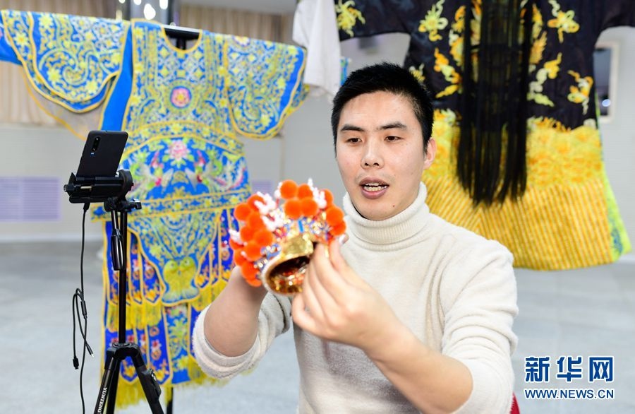 4月19日,內(nèi)蒙古婦女兒童中心少兒京劇班教師崔猛通過(guò)網(wǎng)絡(luò)直播平臺(tái)為學(xué)生介紹戲曲工藝品制作技藝。 -